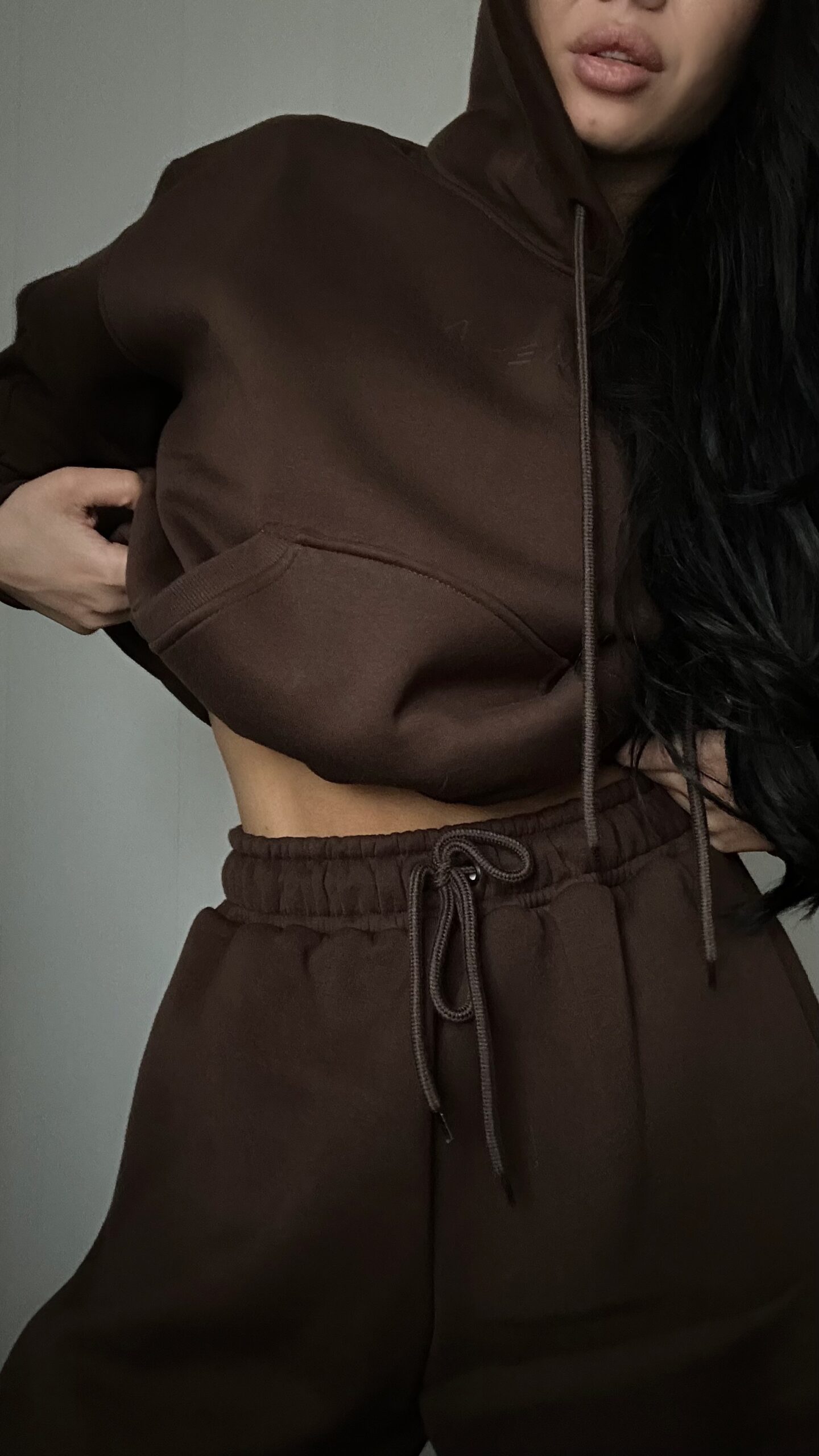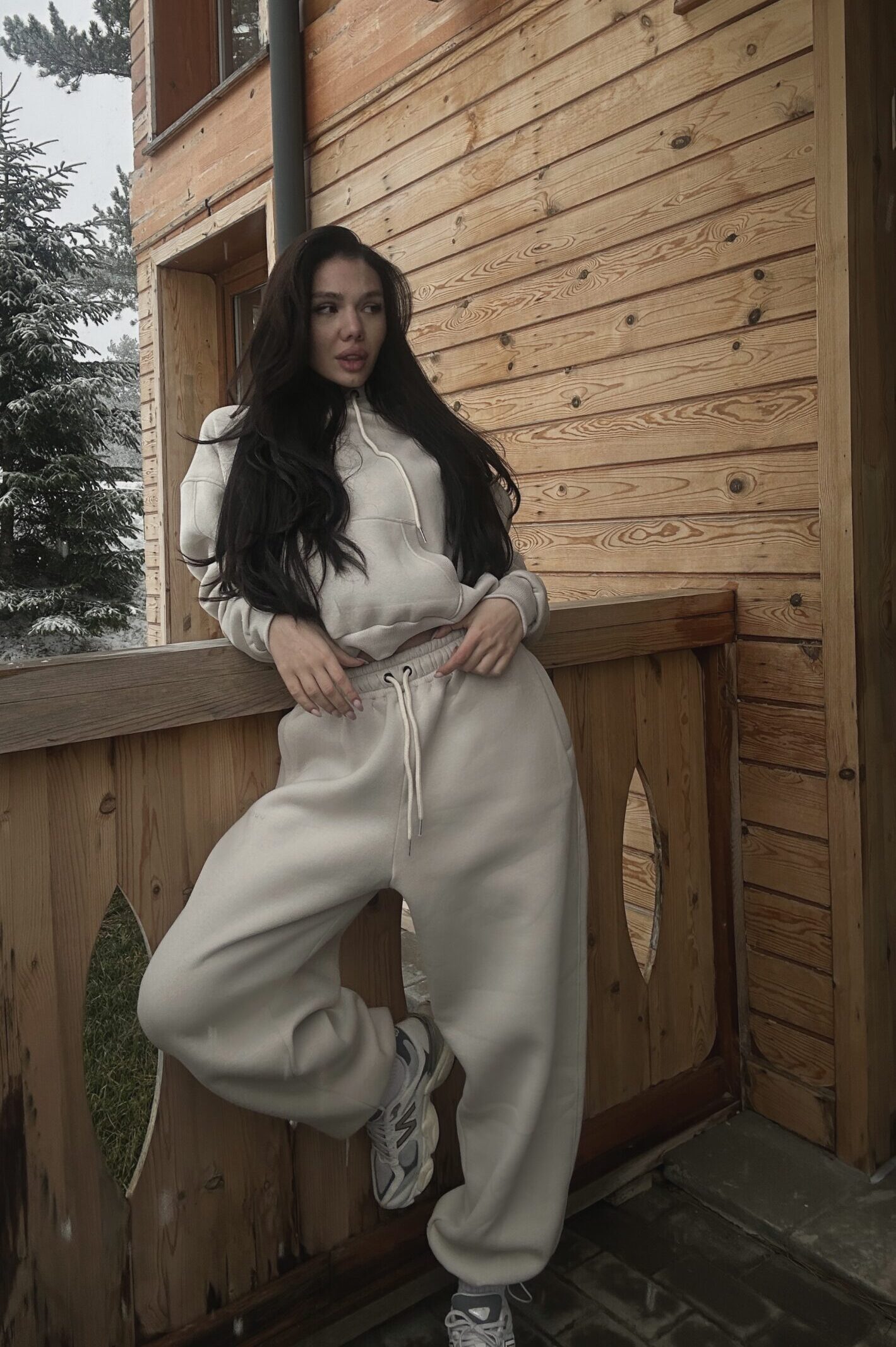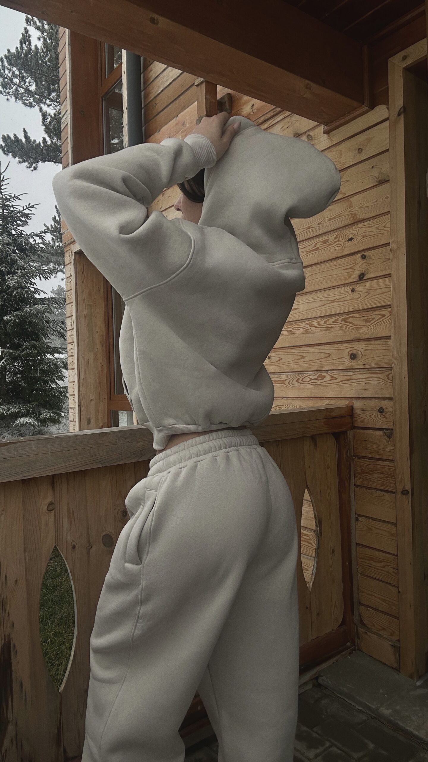 Set din două piese cu croială oversize, elastic și glugă. 100% bumbac.