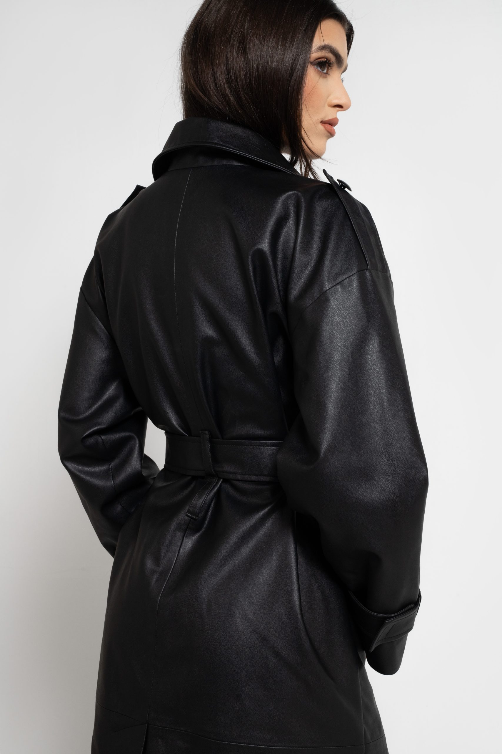 Cusăturile modelatoare accentuează zona taliei, iar gulerul rigid, lipit, adaugă un plus de structură.