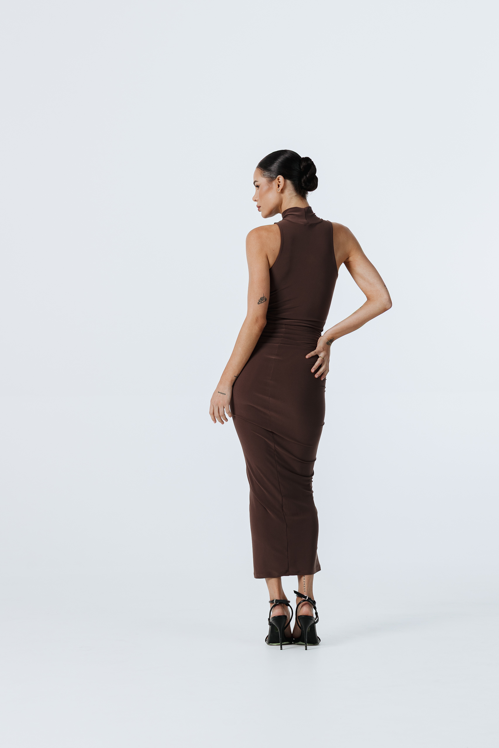 Fustă maxi cu talie înaltă, deschizătură centrală și detaliu cu fronseu și volan.