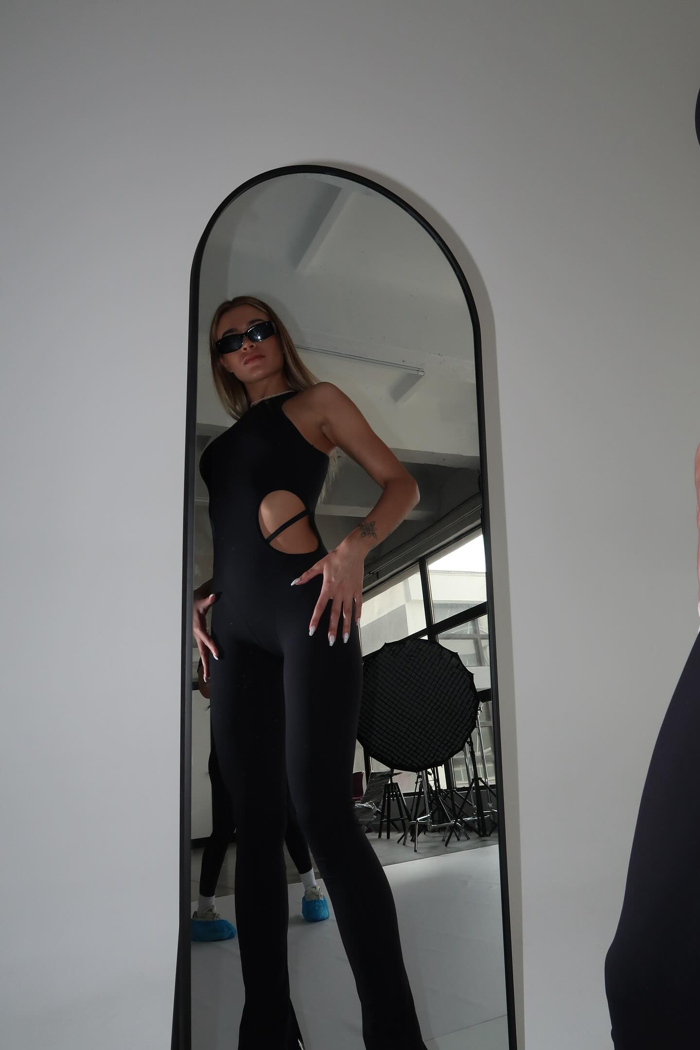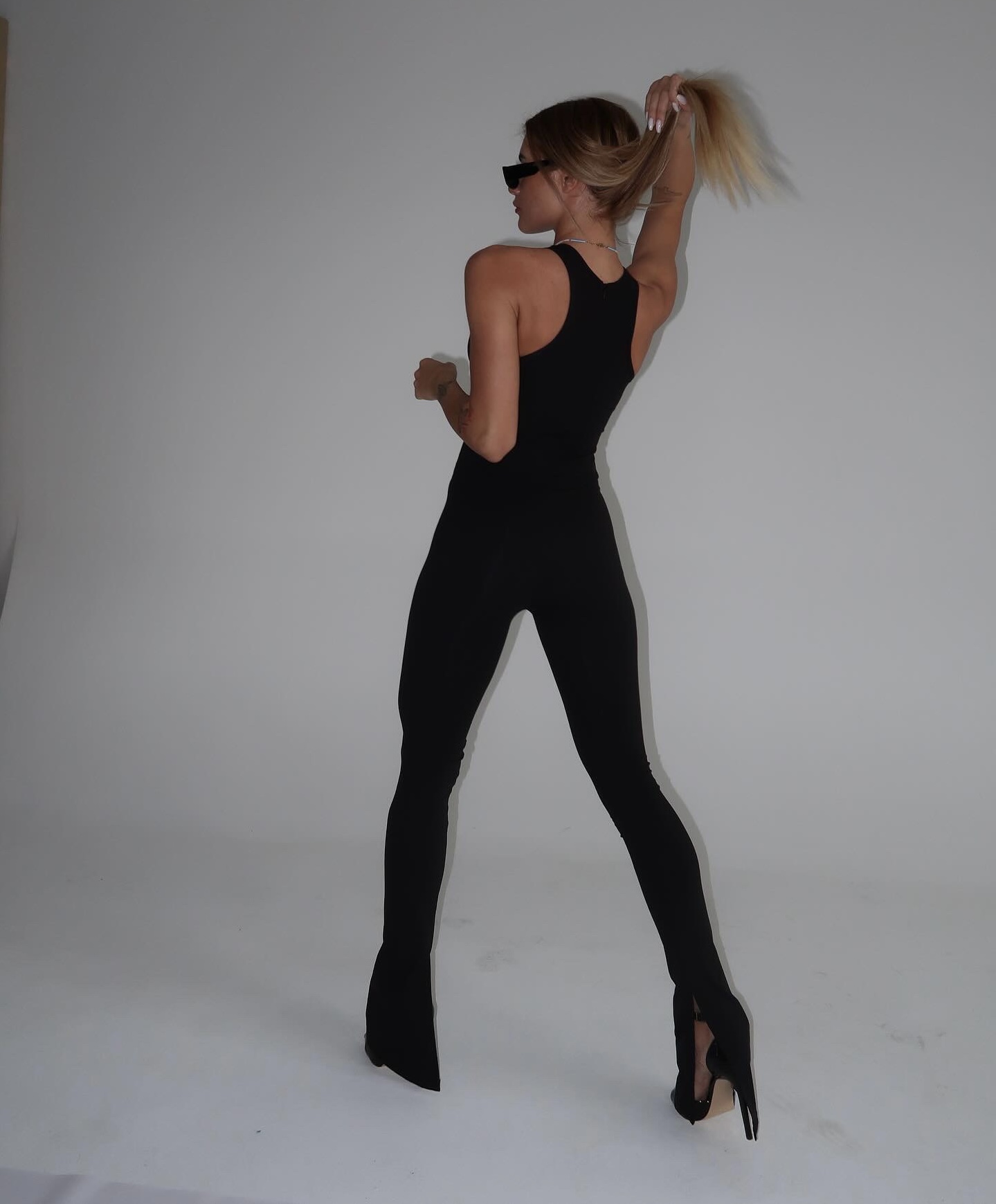 Salopetă elastică Sandra, cu siluetă clasică și pantaloni evazați. Ideală pentru ținute de seară și casual.