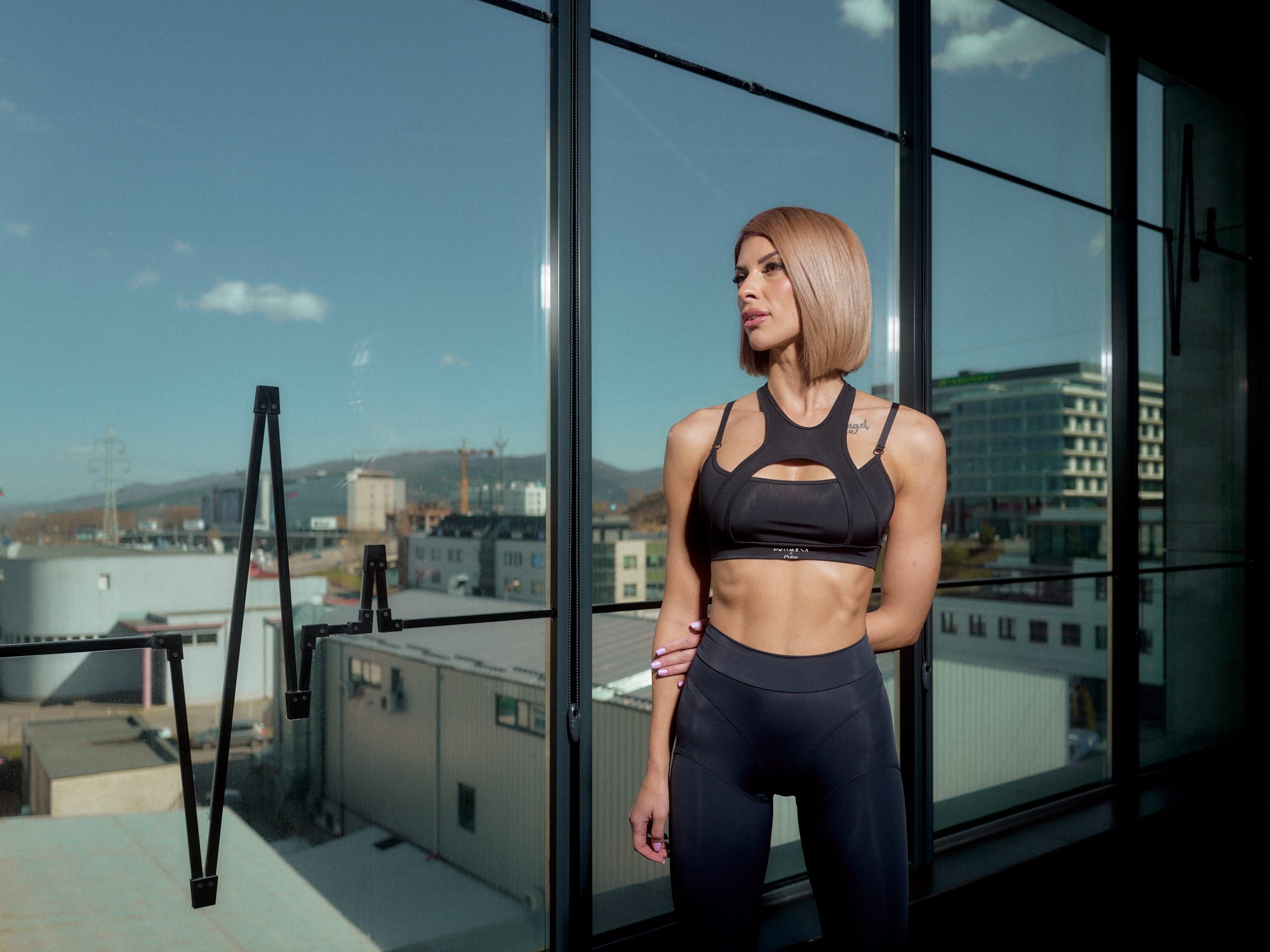 Omnia este o bustieră sport asimetrică cu bretele de două tipuri, parte din colecția noastră pentru un look activ și sportiv.